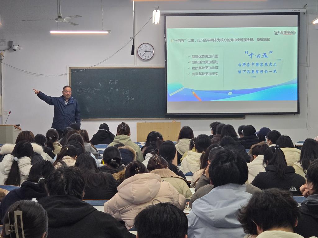 课程开篇,李刚从国家、社会、校园三个维度梳理 “十四五” 发展成果。国家层面,以 GDP 突破 134.9 万亿元、创新指数跻身全球前十等数据,展现经济实力与科技自立自强成就;社会层面,结合城乡收入差距缩小、社会保障网完善等变化,阐释民生福祉提升实效;校园层面,重点介绍学院 “十四五” 期间一系列科研教育成果、实践基地扩容等育人成果。