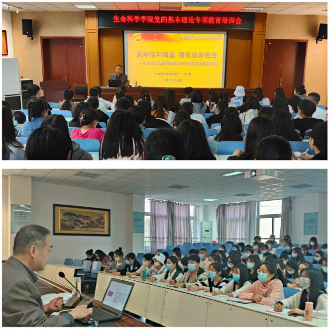 为确保师生党员对党的最新理论成果特别是党的指导思想认识到位,bevictor伟德官网党委于4月21日晚在生科楼414报告厅召开专题党课就党的基本理论进行专项教育培训。学院党委书记李刚以“筑牢信仰根基  强化使命担当——从伟大建党精神汲取党的指导思想的磅礴力量”为题,带领学生党支部书记和全体预备党员在重温革命故事、感悟信仰力量中对党的基本理论和指导思想进行再教育再培训。