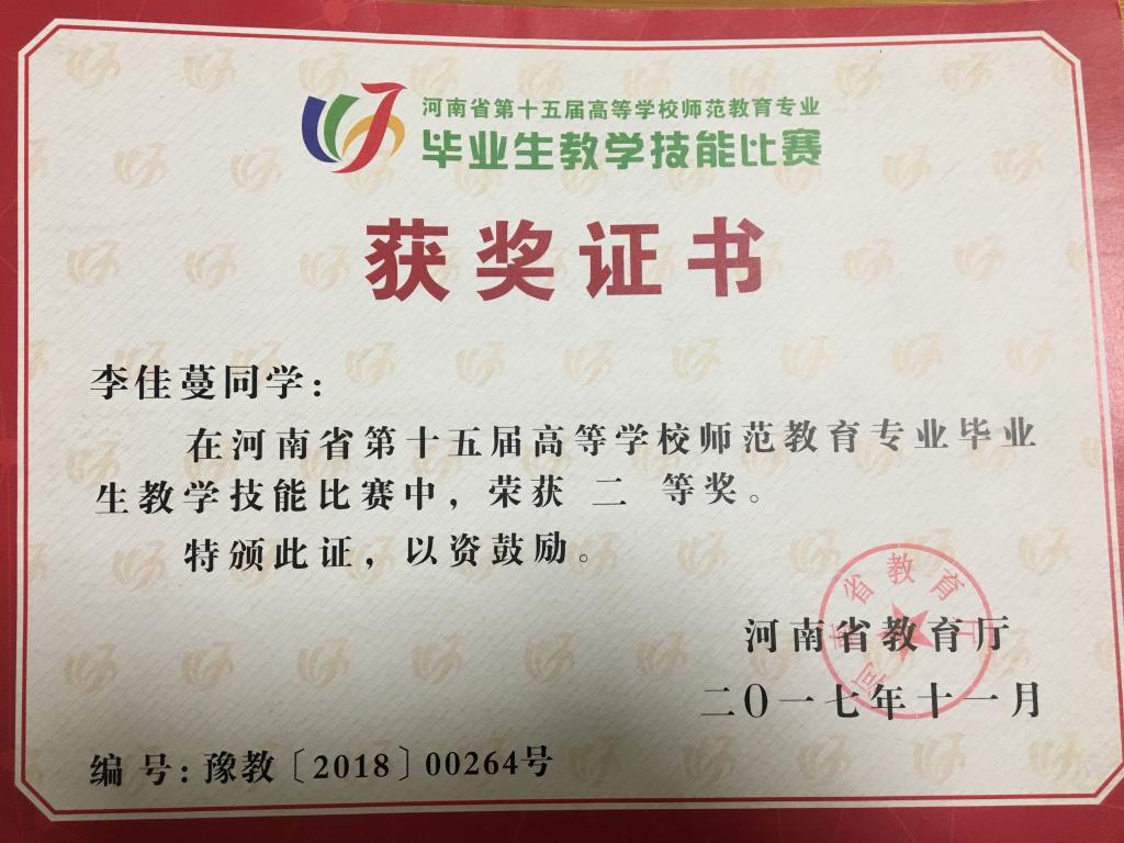 2017河南省第十五届高等学校师范教育专业毕业生教学技能大赛二等奖