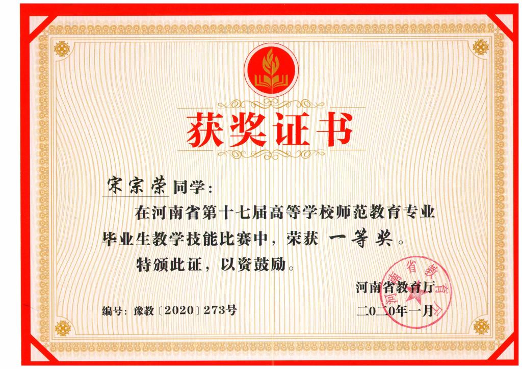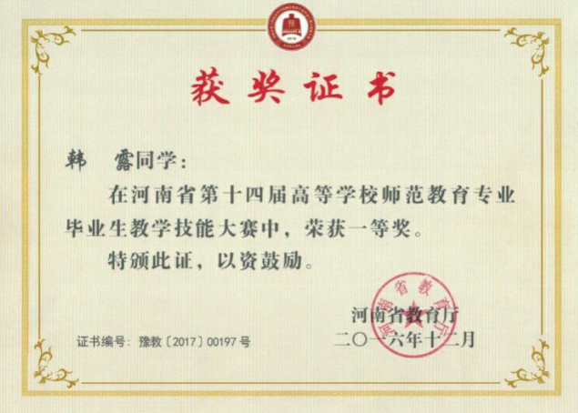 2019年河南省师范毕业生教学技能三等奖
